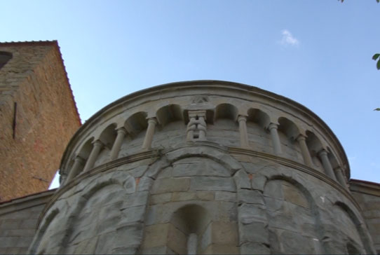 Al XVI secolo appartiene anche il grande oculo che dà luce alla navata centrale sopra la bifora restaurata e riaperta durante i restauri novecenteschi; l'oculo è sormontato da una testa maschile marmorea che la leggenda identificava con un ritratto di Matilde di Canossa, ma dovrebbe provenire in realtà da un complesso forse funerario di età romana situato più a valle, probabilmente ai bordi della Cassia Vetus. Teste a tutto tondo su facciate delle chiese si trovano anche altrove, come per esempio nel lunettone del portale principale della pieve di San Casciano a Settimo (Pisa), del XII secolo, con l'architrave scolpito da Biduino nel 1180: si tratta in questo caso di una testa maschile barbuta. Una particolarità della facciata è il non allineamento di portale e bifora con il culmine del tetto, mentre l'oculo invece, aperto in seguito, si trova benissimo in squadra: questo è dovuto, come vedremo parlando dell'interno, a un errore di calcolo e di progettazione nel passaggio dalla chiesa longobarda a quella romanica, nell'intento di favorire i fedeli dando loro modo di continuare ad assistere alle sacre funzioni.