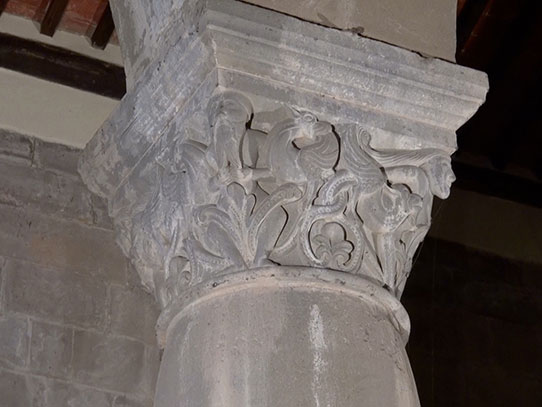 Anche questo capitello si presta a diverse interpretazioni: le figure femminili sfiorano con le mani il collo dei draghi e li circondano in parte con le braccia, come ad accoglierli; vi vedo una posa molto simile all'iconografia della potnia theron, la signora degli animali, che appare già nelle culture preistoriche e torna con varianti attraverso i secoli. Questo motivo si trova anche in epoca romanica: in area emiliana, per esempio, appare in un capitello proveniente dalla chiesa di San Giovanni in Borgo (ora ai Musei Civici di Pavia, sala X), dove la figura femminile tiene per il collo due draghi dalle code intrecciate, o nel Portale dello Zodiaco della Sacra di San Michele in Val di Susa, dell'architetto e scultore Nicholaus (attivo fino al 1139), in un capitello dove due donne allattano serpenti. Ho posto volutamente l'accento sull'area emiliana - Nicholaus, o Niccolò, è di origine piacentina - perché il capitello di Gropina, insieme al precedente, è stato avvicinato stilisticamente proprio a Nicholaus e alla sua cerchia (Gandolfo 2003): attivo a Pavia, a Ferrara e a Verona intorno all'epoca della prima fase romanica di Gropina, Nicholaus accoglie influenze di Wiligelmo e della scultura della Linguadoca, e proprio con questa regine della Francia il Salmi aveva notato affinità a proposito del capitello della nostra pieve. I tralci sinuosi e percorsi da piccoli elementi a rilievo, come il trattamento dei capelli a lunghe linee dritte, appaiono anche nei capitelli di Gislebertus e officina al Saint-Lazare di Autun (c. 1125-1145).